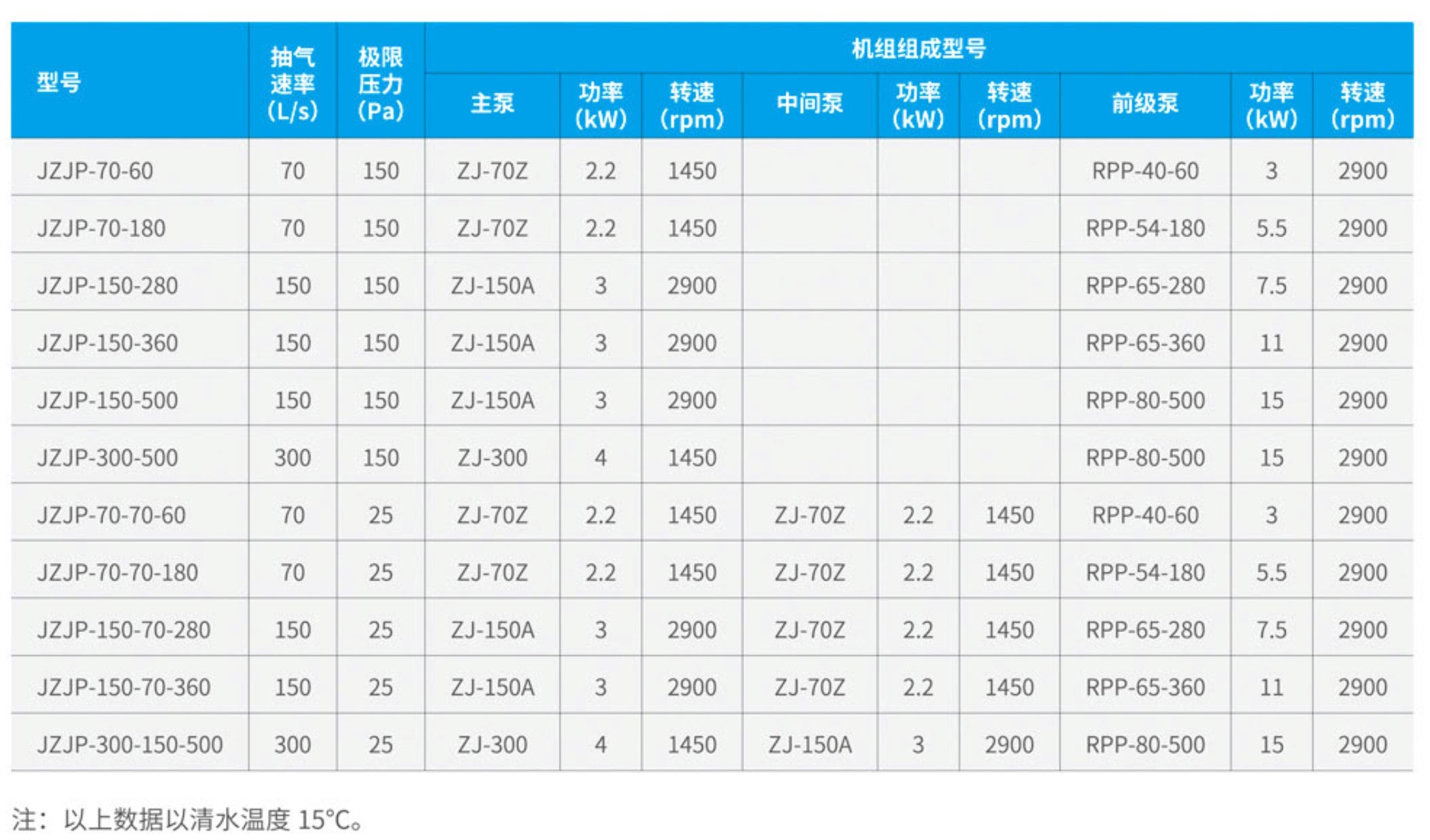 JZJP系列羅茨水噴射真空機組是由羅茨泵(又稱機械增壓泵)為主泵(包括中間泵),水噴射泵為前級泵組成,用全塑臥式水 噴射頁空機組作為前級泵,可抽腐蝕性氣體,一級羅茨泵極限頁 空可達150Pa,二級羅茨泵極限真空可達25Pa。機組廣泛應用千真空干燥、真空蒸溜、 真空濃縮等,在冶金、石油化工、 造紙、食品、電子工業部門得到廣泛的應用??筛鶕蛻魧嶋H需要,可以設計更多級成茬機組,以提高機組的抽氣能力和真空度。
