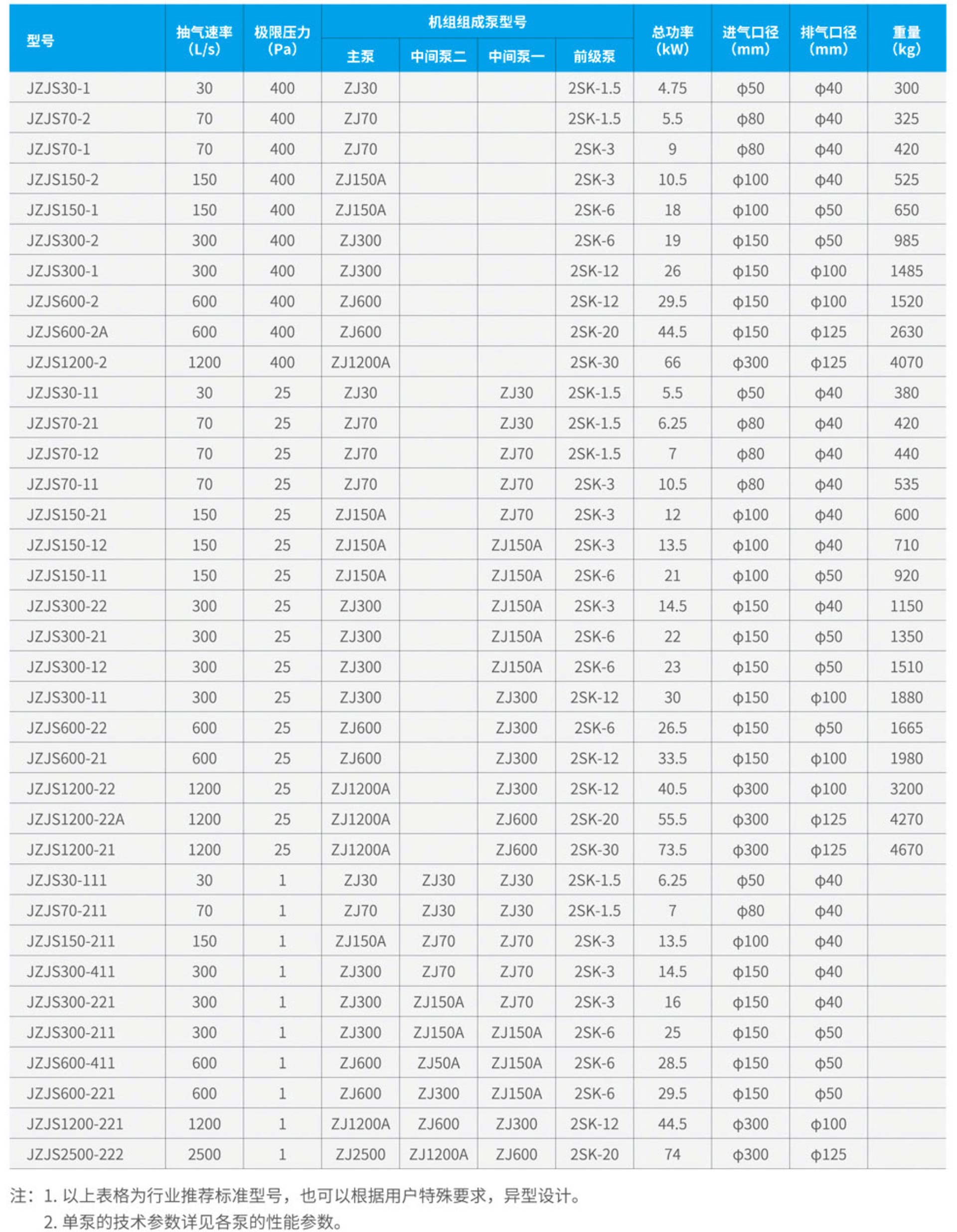 JZJS系列羅茨-水環真空機組,是以羅茨真空泵,(又名羅茨增壓泵)為主泵,以雙極水環式真空泵為前級泵,通過電接點真空表,電接點壓力表來實現羅茨真空泵水環式真空泵的自動啟閉,自動保護及整套機組的安全保護的真空獲得設備。 它除了具有一般羅茨真空泵機組的某些特點外、由于采用水環式真空泵做前級泵,所以它特別適用于抽除含有較多水蒸氣及有一定腐蝕性氣體的工業流程中,例如干燥,脫水,蒸發,蒸餾,結晶等工藝流程。 由于水環式真空泵的極限真空遠比油封機械泵低,所以用水環式真空泵作為前級泵的羅茨真空泵水環泵機組極限真空,比用油封機械泵作前級泵的羅茨真空泵油封機械泵的極限真空低。本型號三級機組的極限真空為25Pa,二級機組的極限真空為400Pa,但這樣的極限真空對上述工業流程的要求已完全可以滿足了。
